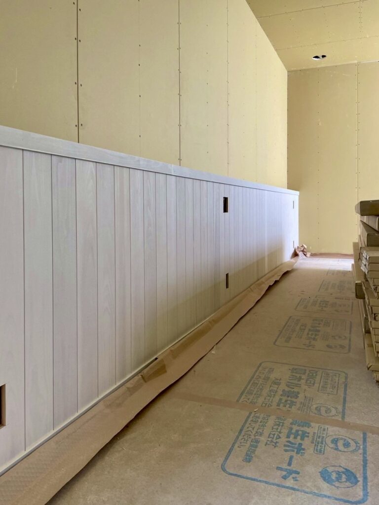 2階主寝室のベッドヘッドに間接照明を設置するのですが、今回はオーク無垢材にて腰板を製作していただきました。