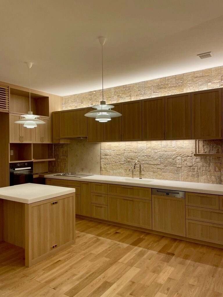 ポルトガルから輸入された自然石を、職人さんが丁寧に、キッチンやリビング、玄関に施工。