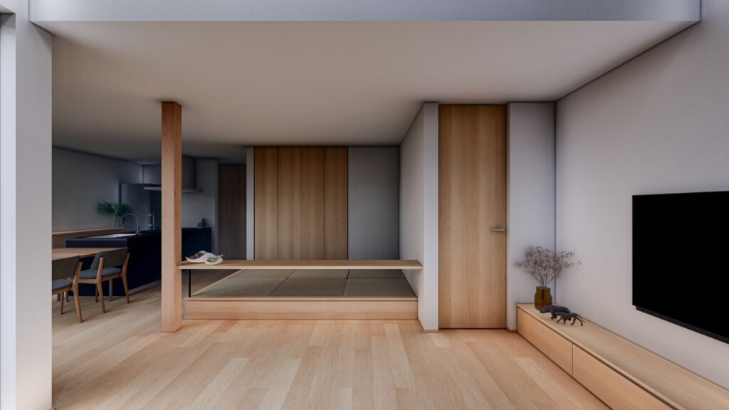 今回はダイニングキッチンとリビングルームの間にひとつの空間(畳スペース)を設け、そこから生まれる会話を愉しむことができるプランニングとなっております。